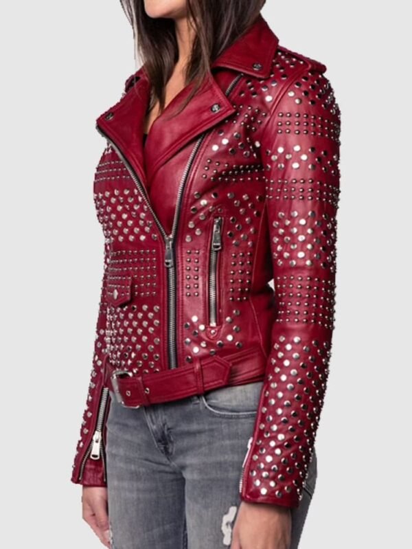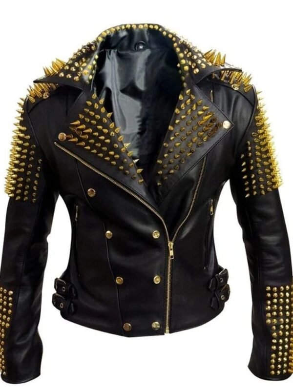 Black Heavy Metal Gold Studs Motorbike Leather Jacket for Women