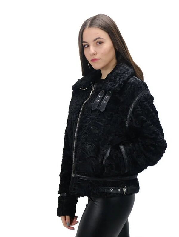 Persian Trimmed Noir Leather Biker Jacket for Women