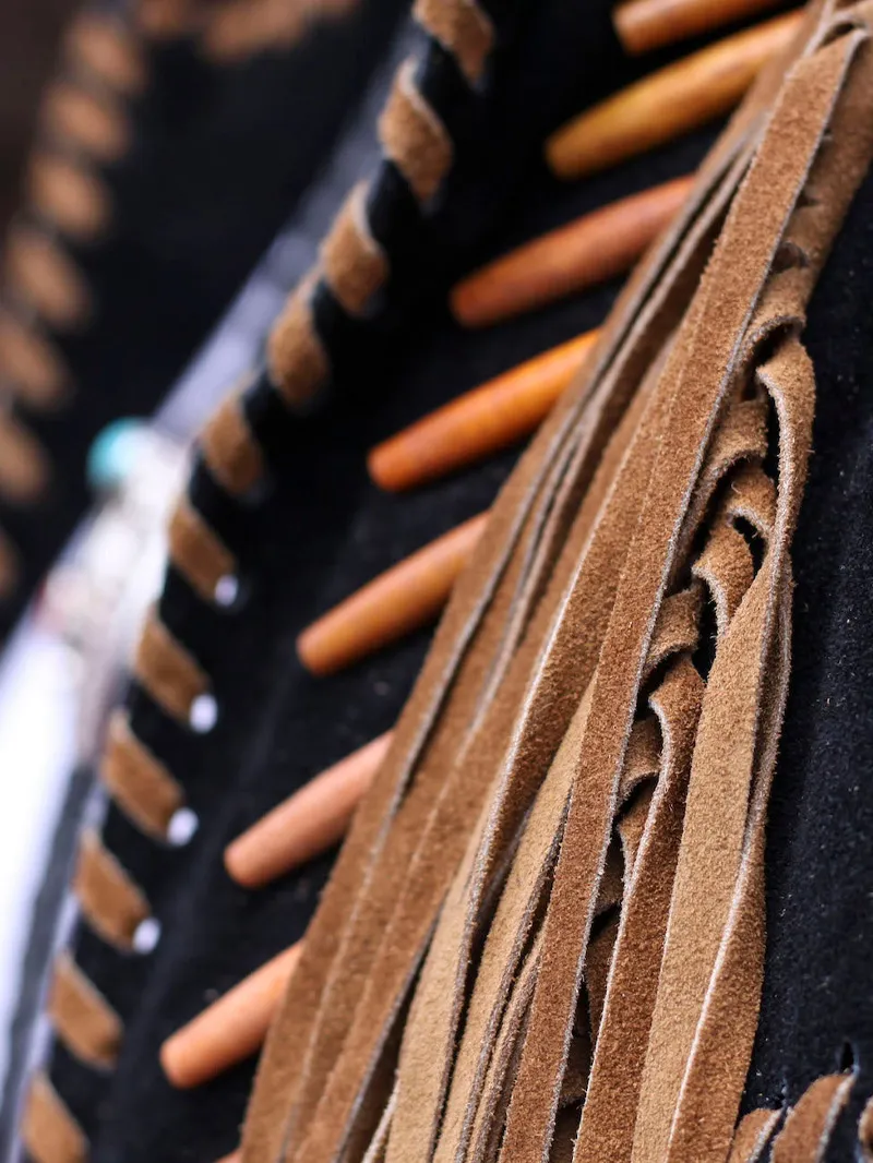 - Shoulders: Two embroidered hand-laced patches with fringes around the shoulders