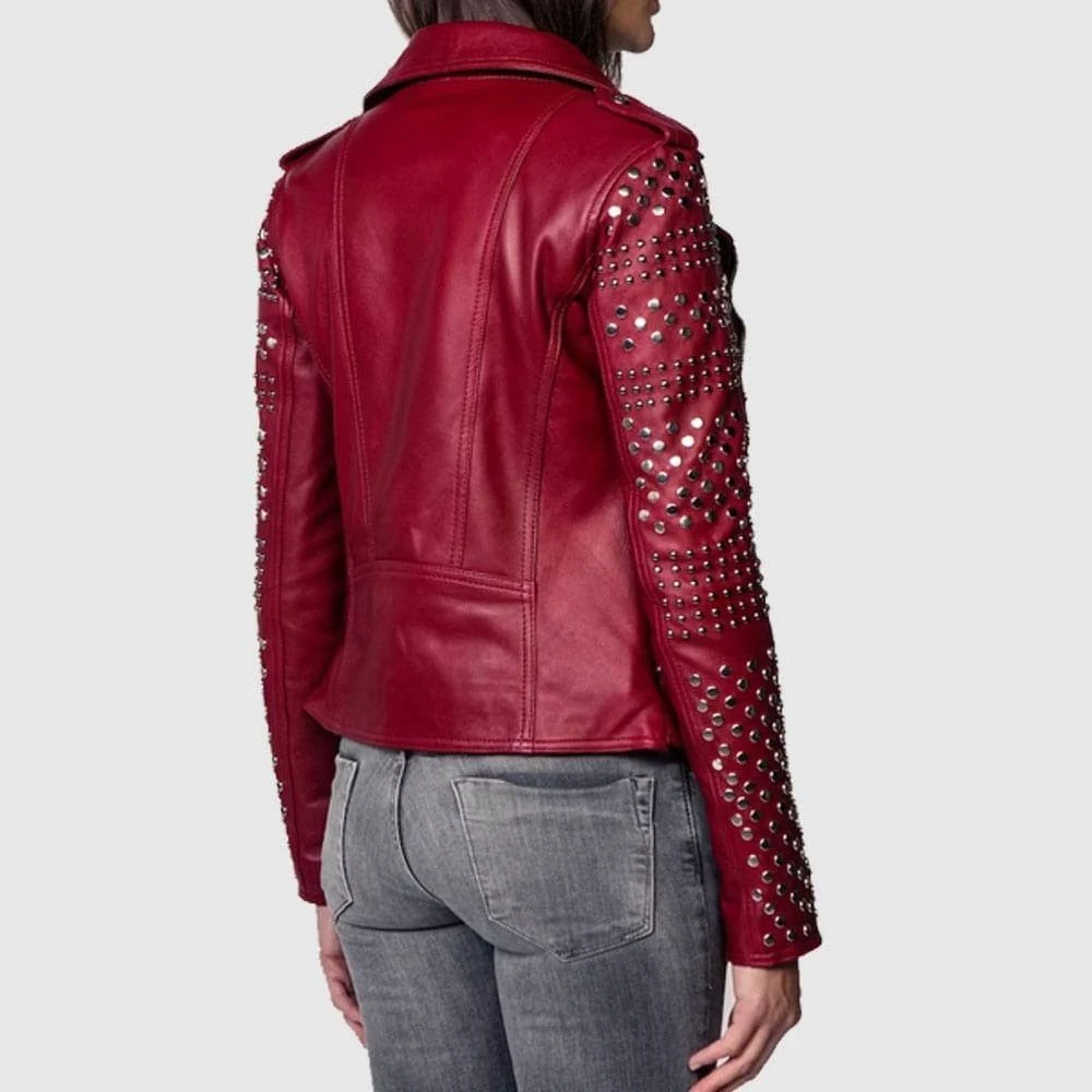 Burgundy Studded Leather Jacket for Women