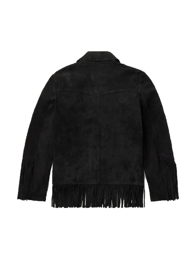 - Its pure black color gives this Fringe Suede Jacket a classic look.