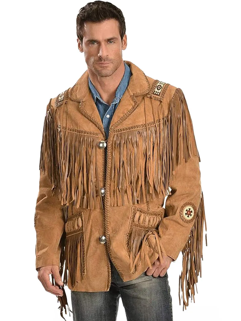 Classic Men’s Western Style Cow Suede Leather Jacket with Fringe and Beaded Detail