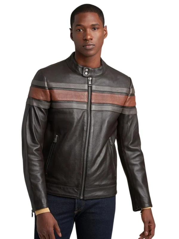 Elevate your style with the Drew leather jacket, featuring a sleek racer design enhanced by stretch leather inserts for comfort and flexibility.