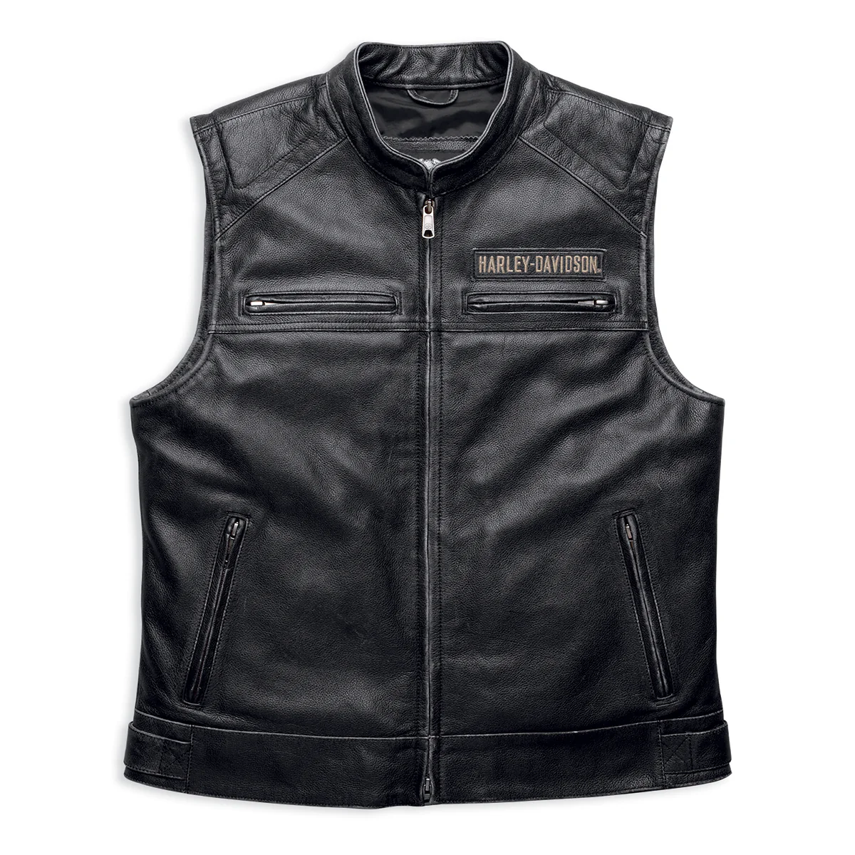 One of the standout features of this vest is the large embossed Harley-Davidson inspired logo on the back. The bold “Motor Harley-Davidson Cycles” design represents classic motorcycle heritage and instantly gives the vest a recognizable biker identity.