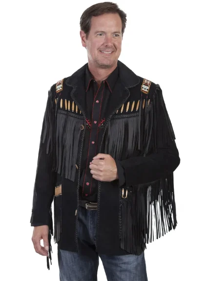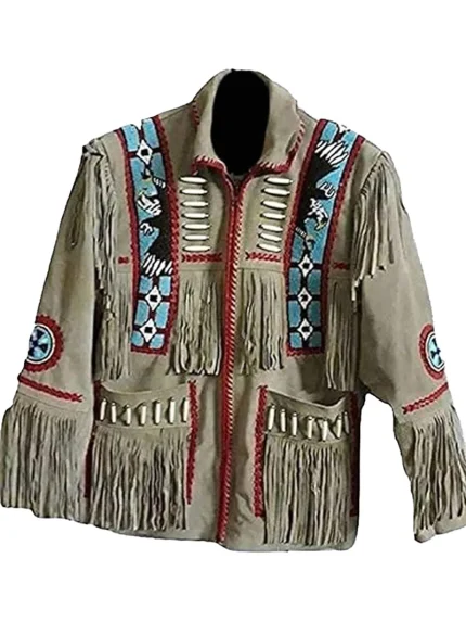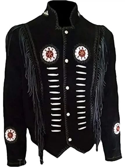 Men’s Western Eagle Beads Design With Fringes & Bones Jacket Suede