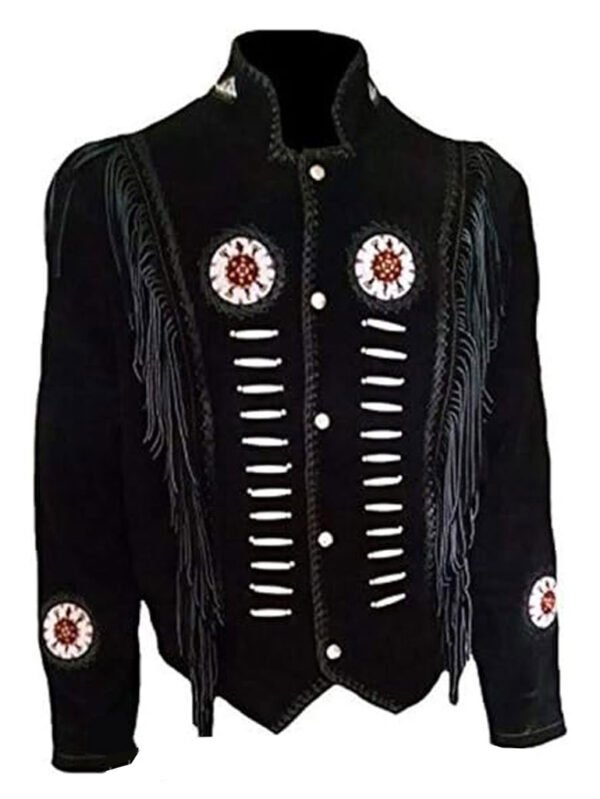- Stylish Fringe Detailing: Features fringe accents along the sleeves, adding a dynamic and stylish element to the jacket’s design.