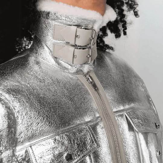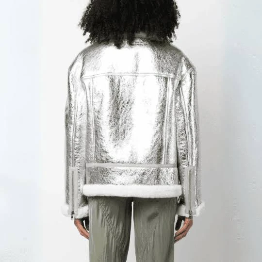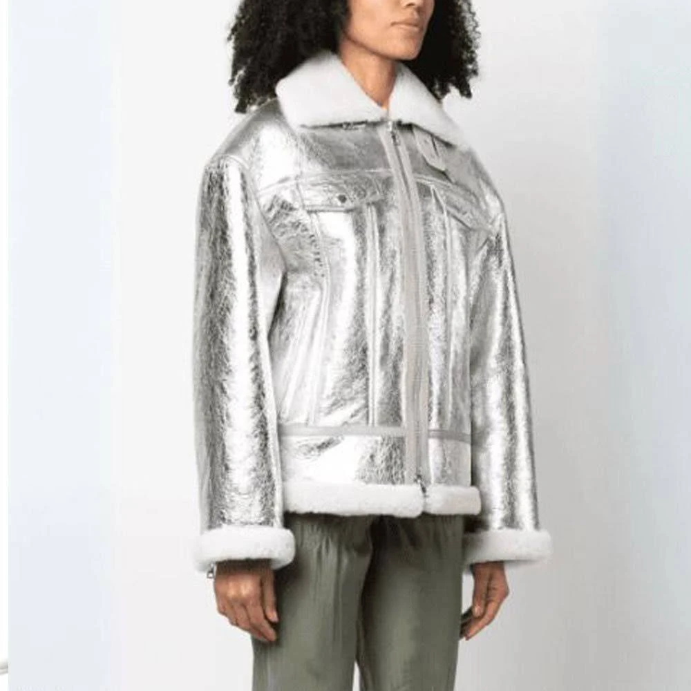 One of the standout features of this jacket is its soft white shearling-style collar. The plush collar not only enhances the jacket’s visual appeal but also provides extra warmth and comfort during colder seasons. Matching shearling trim on the cuffs and hemline adds a balanced design element while keeping the jacket cozy and stylish. This contrast between metallic leather and soft shearling creates a unique blend of elegance and comfort.