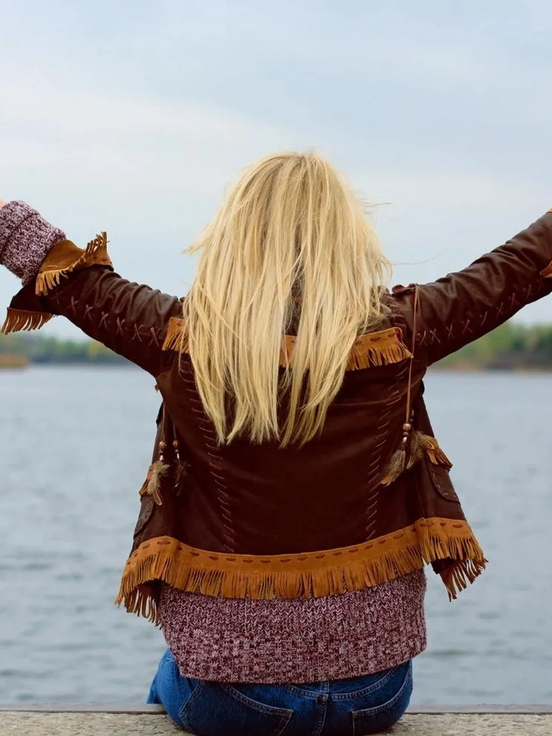 - There’s one inside pocket with a plain front and hand-laced back side of the brown fringe jacket with a short fringed panel on the top to make this jacket visually appealing.