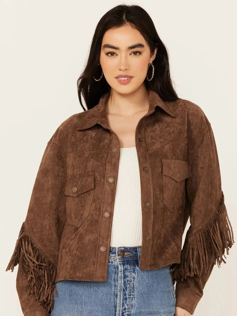 Women's Suede Leather Contrast Stitch Fringe Jacket