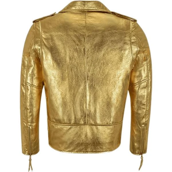 Upgrade your wardrobe with this designer-inspired womens gold leather jacket and embrace a look that is both edgy and elegant.