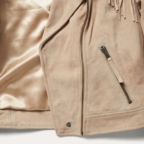 The Women’s Premium Suede Fringe Moto Jacket is a perfect blend of classic biker style and modern fashion. Crafted from high-quality suede leather, this jacket offers a soft texture and luxurious feel while maintaining durability for everyday wear. The neutral beige tone gives the jacket a stylish and versatile look that pairs effortlessly with a variety of outfits.